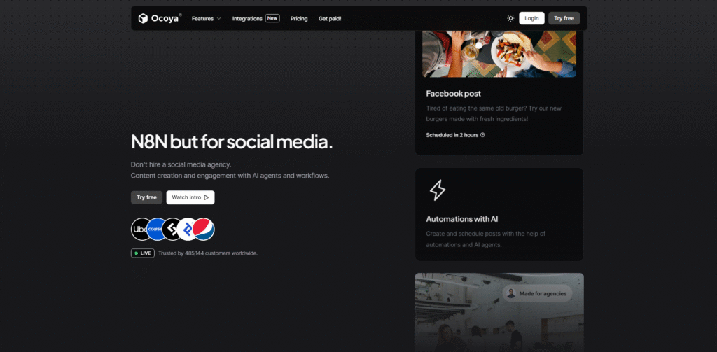 - Ocoya تجمع بين النشر التلقائي والذكاء الاصطناعي لبناء وكيل محتوى (AI agents) يُمكنك من أتمتة جوانب من النشر والتفاعل.
