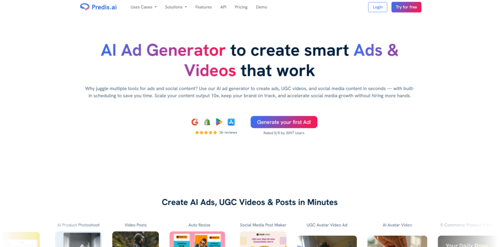 - Predis.ai متخصصة في إنشاء المنشورات (نصوص + صور + فيديوهات) بناءً على الهوية المخصصة للعلامة التجارية، مع تصاميم مخصصة تلقائية.