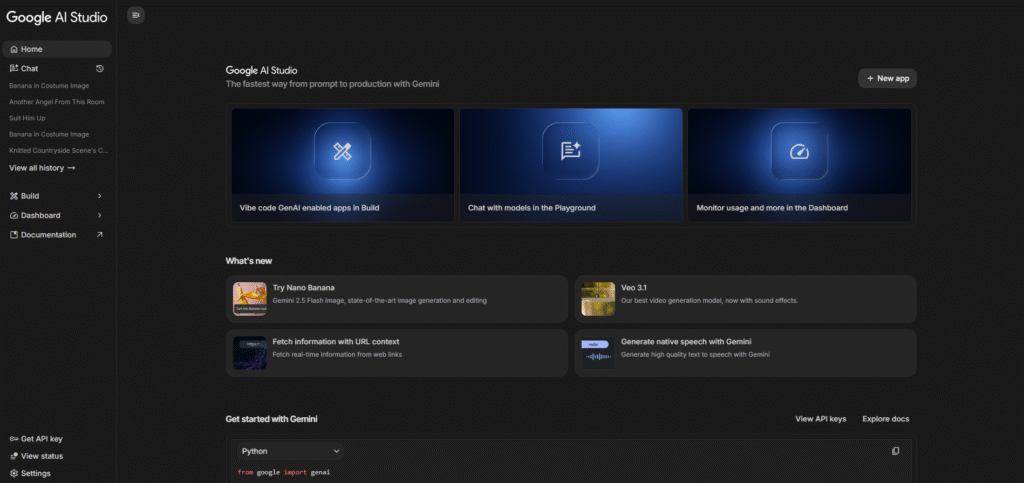 Google AI Studio هو بيئة تطوير متكاملة على الويب (Web-based IDE) تمكّنك من تجربة نماذج الذكاء الاصطناعي من جوجل (Gemini)، وإنشاء التطبيقات التفاعلية مباشرة من متصفحك.